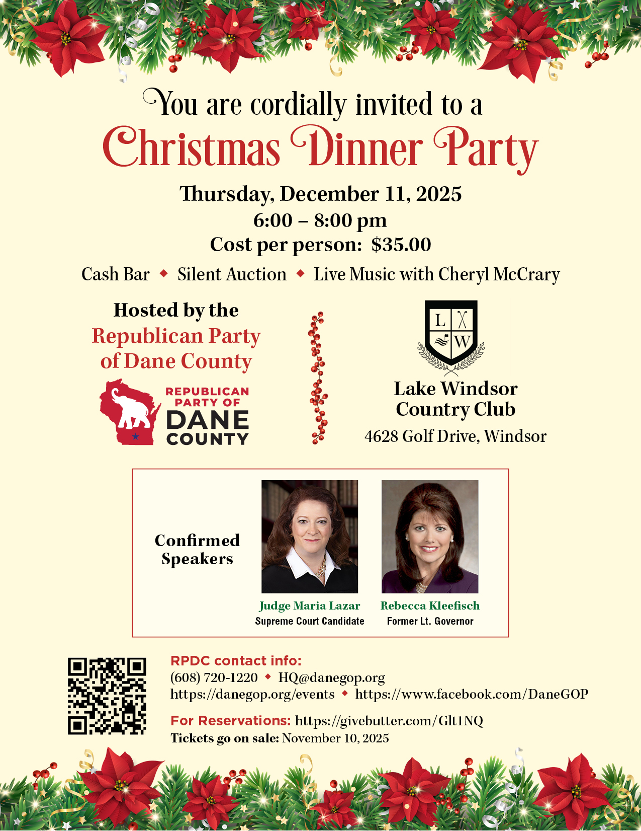 Welcome to the Republican Party of Dane County We need your help to elect local, state, and federal candidates. Join our team today. VOLUNTEER MEMBERSHIP Events Latest News & Blog Why Dane County? Purchase Tickets Meet Byron News & Events News & Events Why Dane County? Lincoln Reagan Day Dinner (LRDD) September 21, 2024 6pm Cocktails 7pm Dinner. News & Events Why Dane County? DONATE REGISTER TO VOTE. Learn More Run for Office Sign Up Upcoming Events March 20, 2025 Secretary RPDC CHRISTMAS PARTY December 11, 2025 at 6pm at Lake Windsor Country Club Read more Sign Up For Newsletter Please enable JavaScript in your browser to complete this form.Name *FirstLastEmail *PhoneSign Up To Receive Republican Party of Dane County Email Newsletter. Sign Up For Newsletter Please enable JavaScript in your browser to complete this form.Name *FirstLastEmail *CommentSign Up