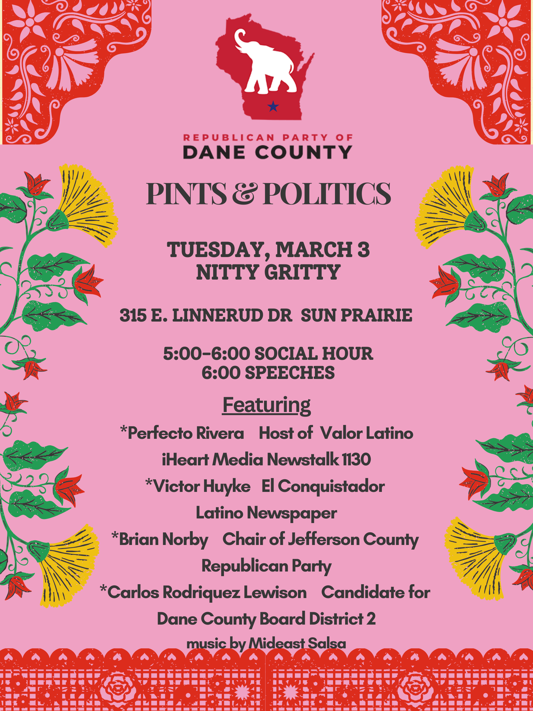 Welcome to the Republican Party of Dane County We need your help to elect local, state, and federal candidates. Join our team today. VOLUNTEER MEMBERSHIP Events Latest News & Blog Why Dane County? Purchase Tickets Meet Byron News & Events News & Events Why Dane County? Lincoln Reagan Day Dinner (LRDD) September 21, 2024 6pm Cocktails 7pm Dinner. News & Events Why Dane County? DONATE REGISTER TO VOTE. Learn More Run for Office Sign Up Upcoming Events February 1, 2026 Secretary PINTS & POLITICS. March 3rd 2026 5pm at Nitty Gritty, Sun Prairie, Wisconsin Read more Sign Up For Newsletter Please enable JavaScript in your browser to complete this form.Name *FirstLastEmail *EmailSign Up To Receive Republican Party of Dane County Email Newsletter. Sign Up For Newsletter Please enable JavaScript in your browser to complete this form.Name *FirstLastEmail *WebsiteSign Up