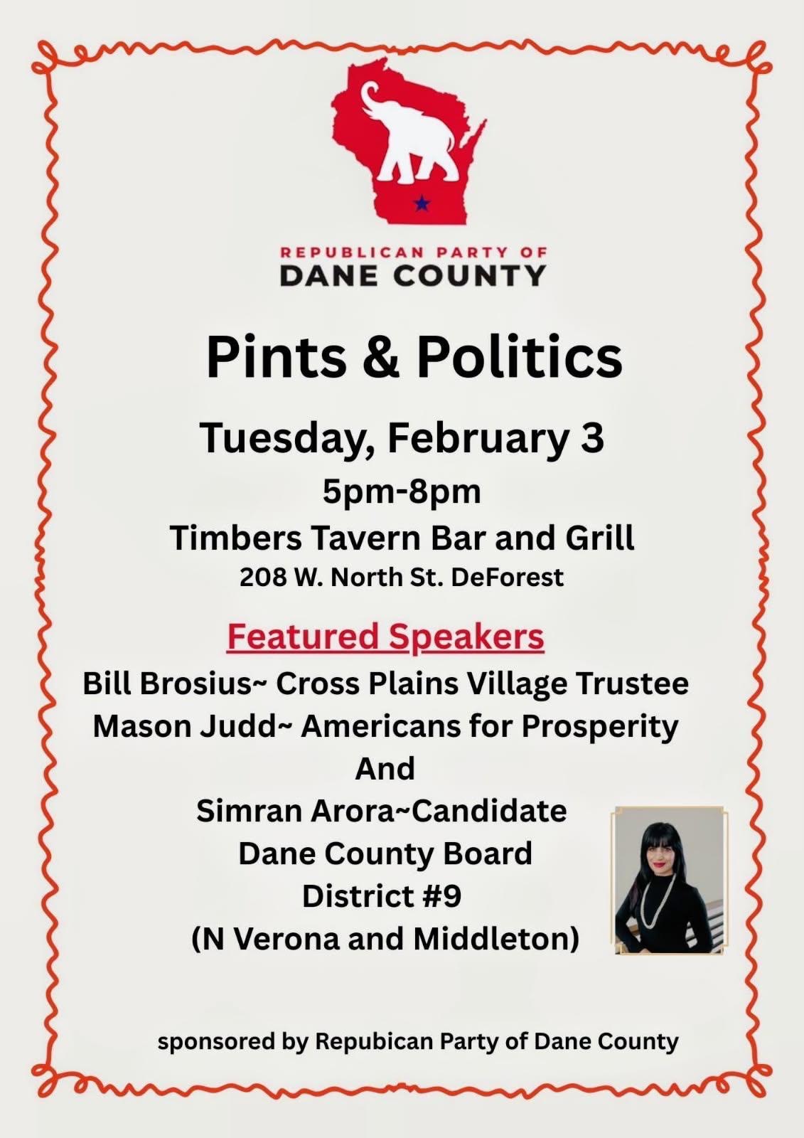 Welcome to the Republican Party of Dane County We need your help to elect local, state, and federal candidates. Join our team today. VOLUNTEER MEMBERSHIP Events Latest News & Blog Why Dane County? Purchase Tickets Meet Byron News & Events News & Events Why Dane County? Lincoln Reagan Day Dinner (LRDD) September 21, 2024 6pm Cocktails 7pm Dinner. News & Events Why Dane County? DONATE REGISTER TO VOTE. Learn More Run for Office Sign Up Upcoming Events February 1, 2026 Secretary PINTS & POLITICS. February 3rd 2026 5pm at Timbers Tavern Bar & Grill, Deforest, Wisconsin Read more March 20, 2025 Secretary CALL TO CAUCUS, FEBRUARY 14th at 8am at Lake Windsor Country Club, Windsor, Wisconsin Read more Sign Up For Newsletter Please enable JavaScript in your browser to complete this form.Name *FirstLastEmail *WebsiteSign Up To Receive Republican Party of Dane County Email Newsletter. Sign Up For Newsletter Please enable JavaScript in your browser to complete this form.Name *FirstLastEmail *EmailSign Up
